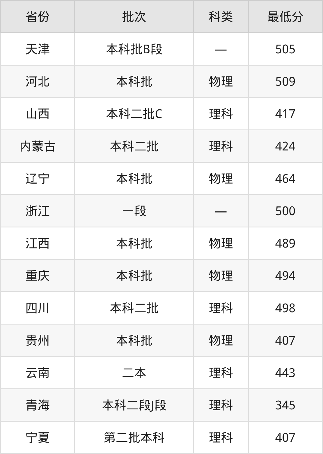 天津医科大学临床医学院药学专业录取分数线从345分到509分不等,在部分地区的最低分数线如下: