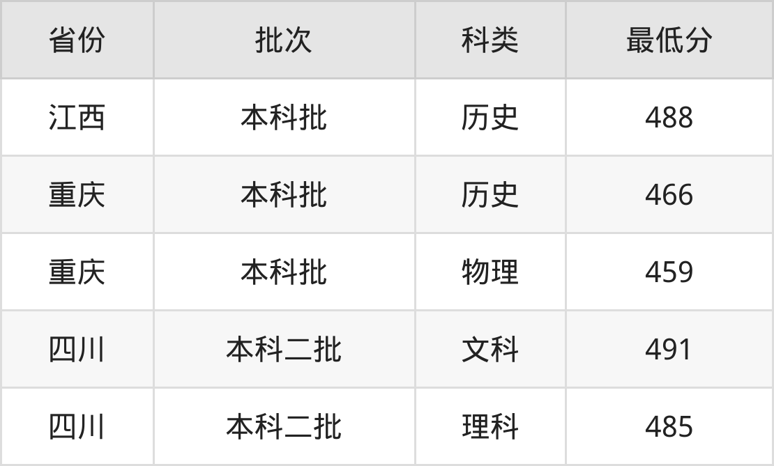 重庆外语外事学院文化产业管理专业在全国各省最低录取分数线为459分(重庆物理类),除此之外,在其余地区的最低分为四川理科485分、江西历史类488分,以上数据均为2024年数据,供2025年高考生参考。