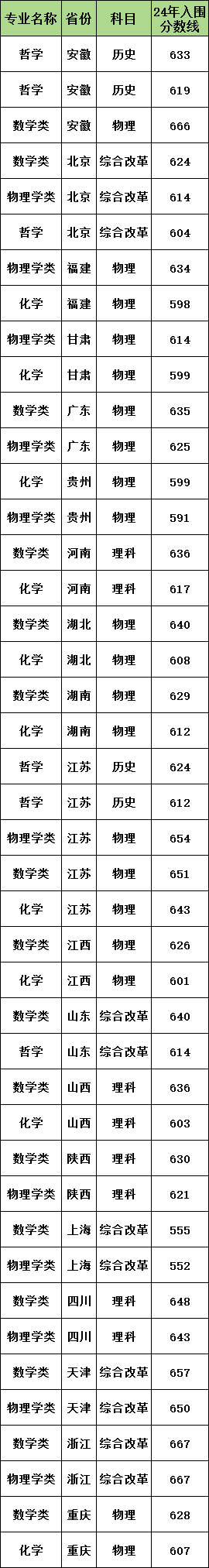 可见不同专业在不同省份的招生分数门槛各有差异,下面以化学、哲学为例,列举各省入围最低分: