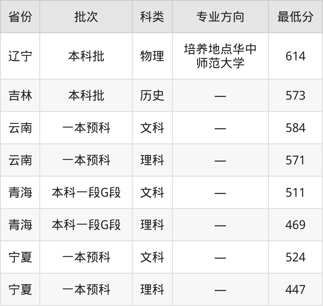 华中师范大学本科预科班专业录取分数线从447分到614分不等,最低分数线如下: