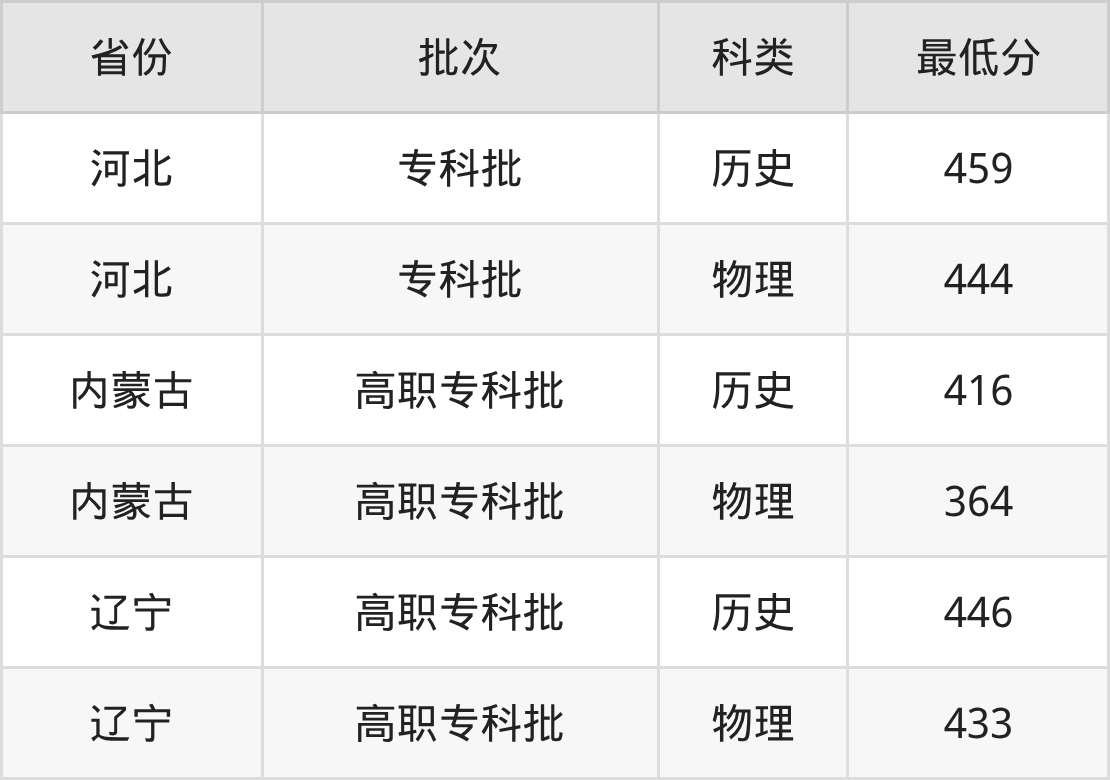 黑龙江护理高等专科学校中医学专业录取分数线从364分到459分不等,最低分数线如下: