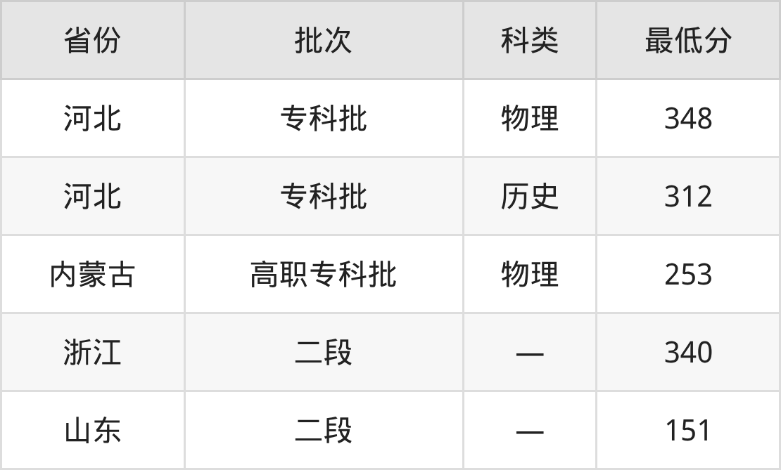德州工程职业学院数字媒体技术专业在全国各省最低录取分数线为151分(山东),除此之外,在其余地区的最低分为河北历史类312分、内蒙古物理类253分、浙江340分,以上数据均为2025年数据,供2026年高考生参考。