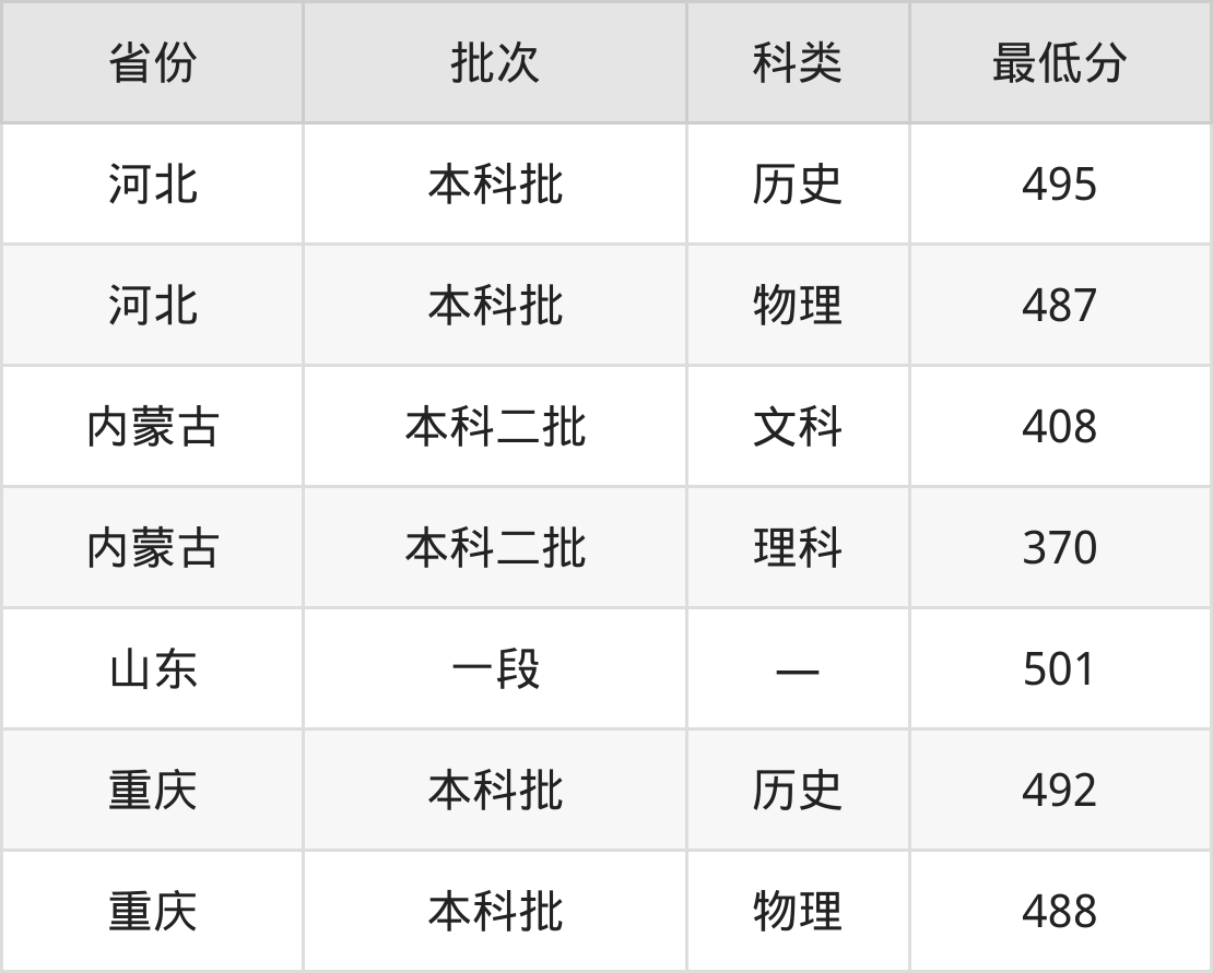 陇东学院健康服务与管理专业在全国各省最低录取分数线为370分(内蒙古理科),除此之外,在其余地区的最低分为山东501分、重庆物理类488分、河北物理类487分,以上数据均为2024年数据,供2025年高考生参考。
