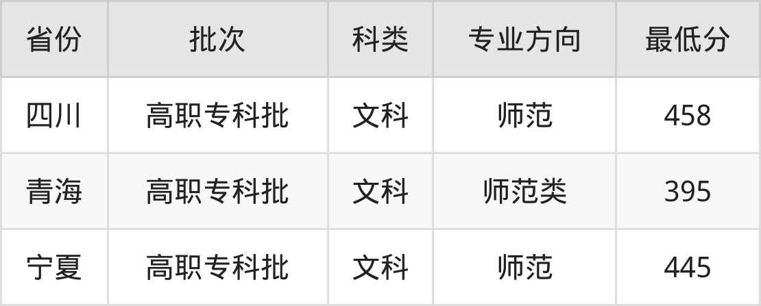 陇南师范学院小学语文教育专业录取分数线从395分到458分不等,最低分数线如下: