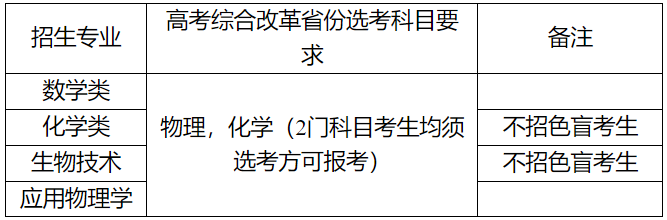 共计4个专业,其中包括数学类、化学类、生物技术、应用物理学。化学类、生物技术专业不招色盲考生。高考综合改革省份选考科目要求为物理、化学。