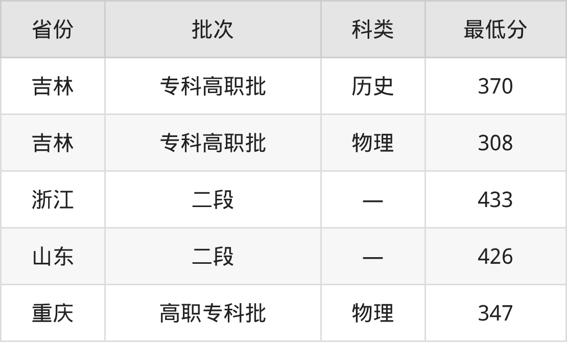 吉林交通职业技术学院新能源汽车技术专业在全国各省最低录取分数线为308分(吉林物理类),除此之外,在其余地区的最低分为浙江433分、山东426分、重庆物理类347分,以上数据均为2025年数据,供2026年高考生参考。