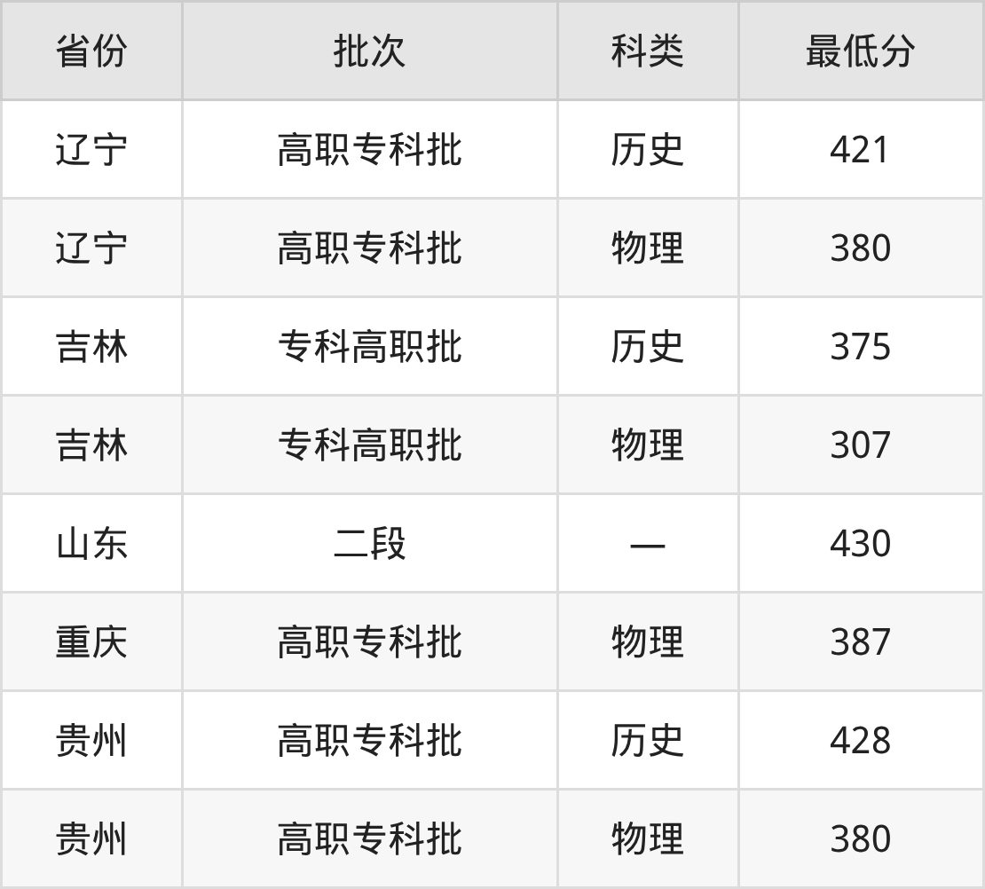 黑龙江司法警官职业学院司法信息技术专业在全国各省最低录取分数线为307分(吉林物理类),除此之外,在其余地区的最低分为山东430分、重庆物理类387分、贵州物理类380分、辽宁物理类380分等,以上数据均为2025年数据,供2026年高考生参考。