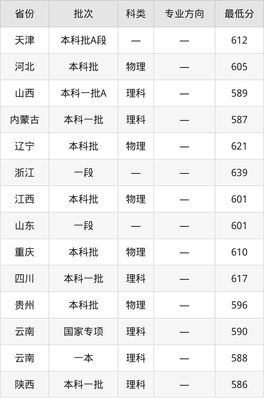 华中农业大学计算机类专业录取分数线从586分到639分不等,在部分地区的最低分数线如下: