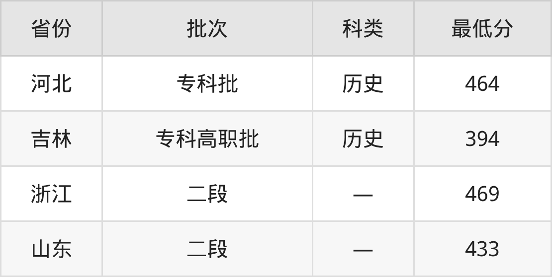 日照职业技术学院食品智能加工技术专业在全国各省最低录取分数线为394分(吉林历史类),除此之外,在其余地区的最低分为河北历史类464分、浙江469分、山东433分,以上数据均为2025年数据,供2026年高考生参考。