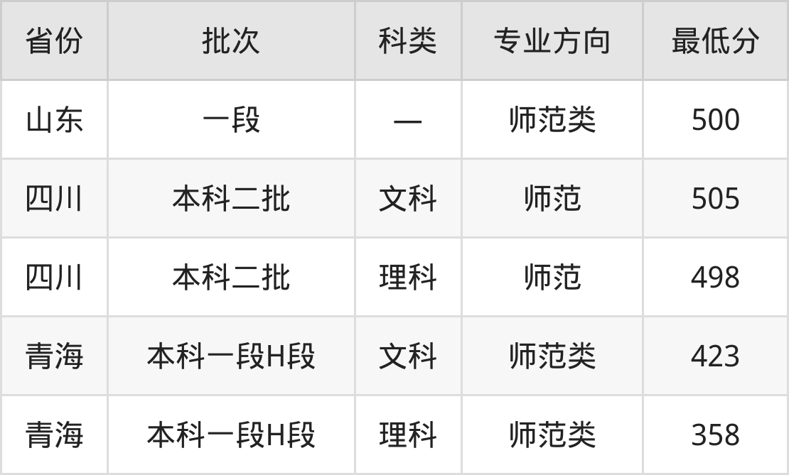 陇南师范学院学前教育专业录取分数线从358分到505分不等,最低分数线如下:
