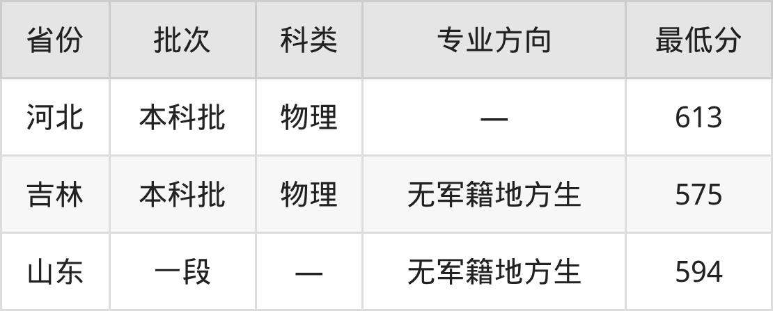 中国人民解放军空军军医大学生物技术专业在全国各省最低录取分数线为575分(吉林物理类),除此之外,在其余地区的最低分为山东594分、河北物理类613分,以上数据均为2025年数据,供2026年高考生参考。