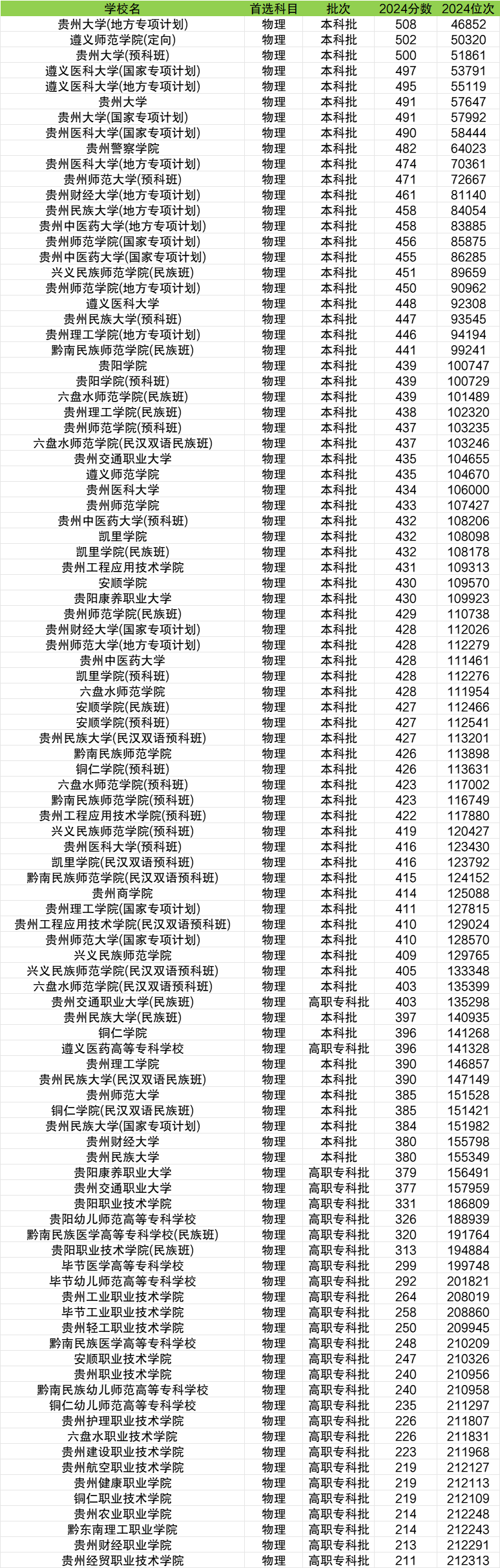 想要知道2025年该填报哪所大学,需要了解往年大学在贵州的最低录取分数线及位次情况,碍于篇幅限制,本文仅收集了2024年贵州省内公办大学招收物理类本科生的最低分数线及位次信息(分数线TOP100专业组)。