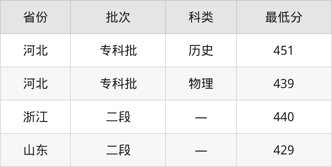 武汉交通职业学院港口与航运管理专业在全国各省最低录取分数线为429分(山东),除此之外,在其余地区的最低分为河北物理类439分、浙江440分,以上数据均为2025年数据,供2026年高考生参考。