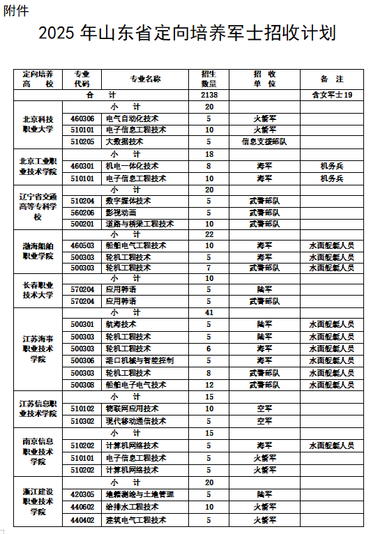 2025山东定向士官招生计划为2138人,2025年各院校在山东招收定向培养军事生的计划为:东华理工大学8人、江西航空职业技术学院62人、武汉船舶职业技术学院22人等。
