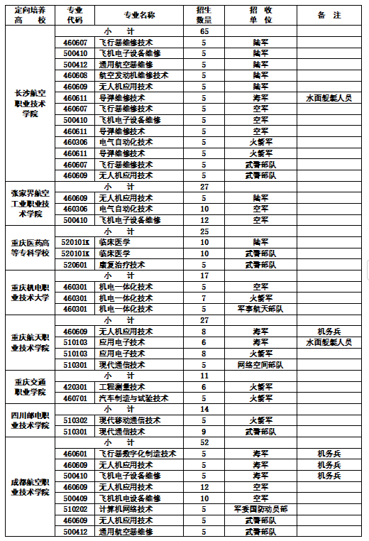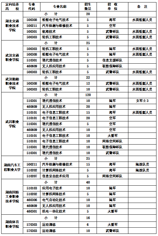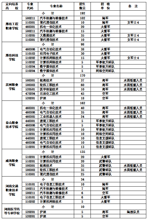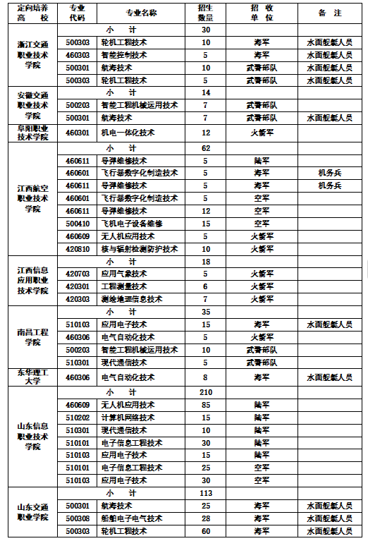目前出各大学在山东招收定向士官生的具体招生计划已经公布,各院校招生计划如下: