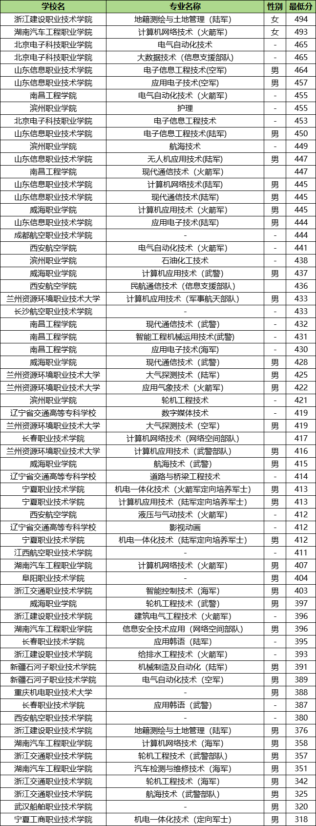 录取分数线最高的是浙江建设职业技术学院地籍测绘与土地管理(陆军、女),2024分数线为494分;录取分数线最低的是宁夏工商职业技术学院机电一体化技术(男),2024分数线为318分。