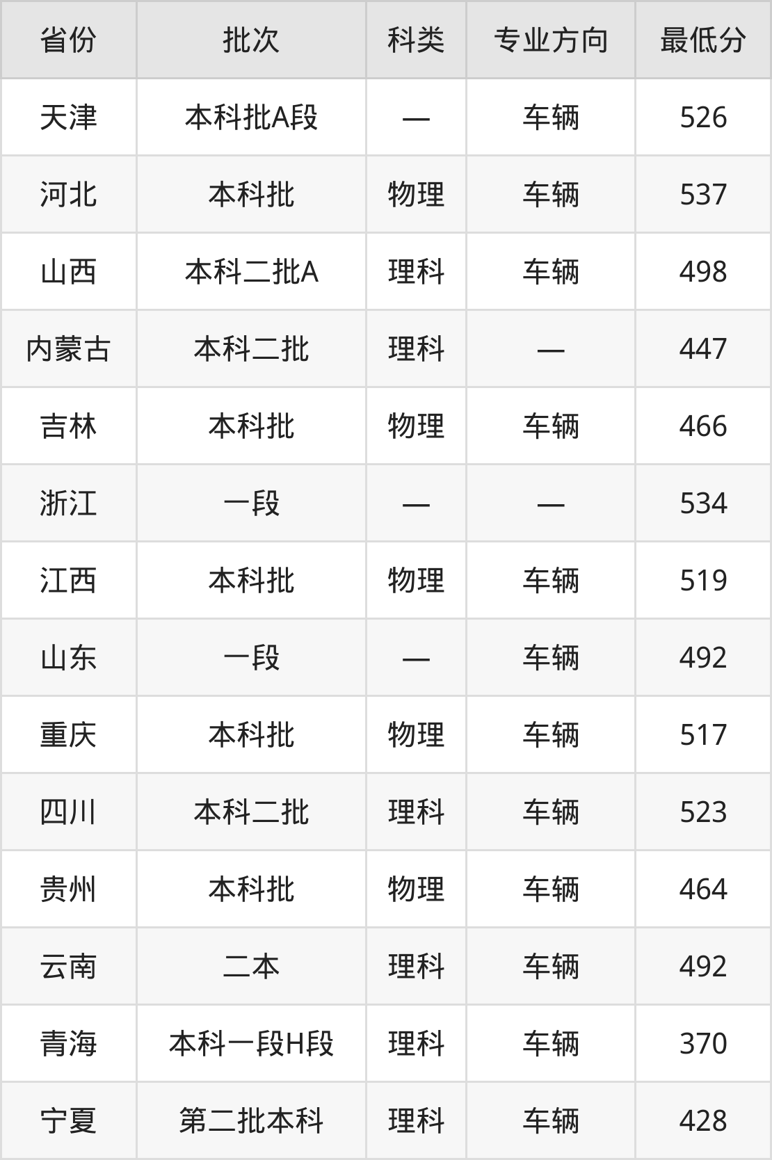 山东交通学院机械类专业录取分数线从370分到537分不等,在部分地区的最低分数线如下: