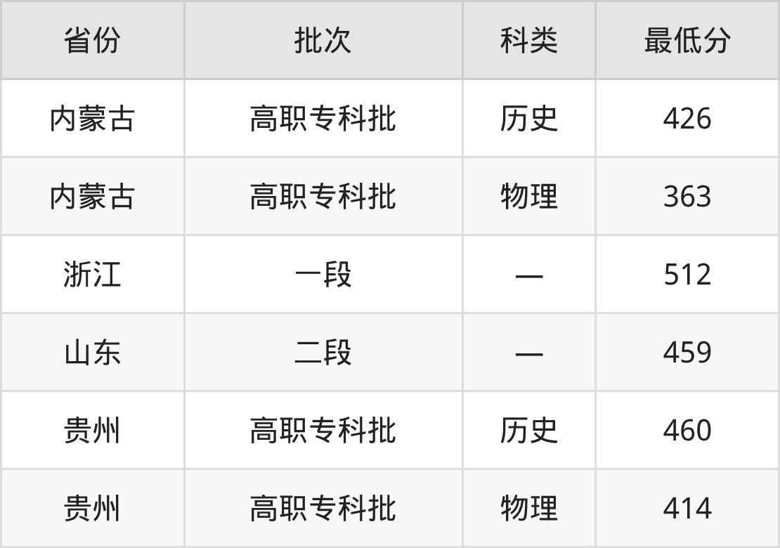 湖南铁道职业技术学院动车组检修技术专业在全国各省最低录取分数线为363分(内蒙古物理类),除此之外,在其余地区的最低分为浙江512分、山东459分、贵州物理类414分,以上数据均为2025年数据,供2026年高考生参考。