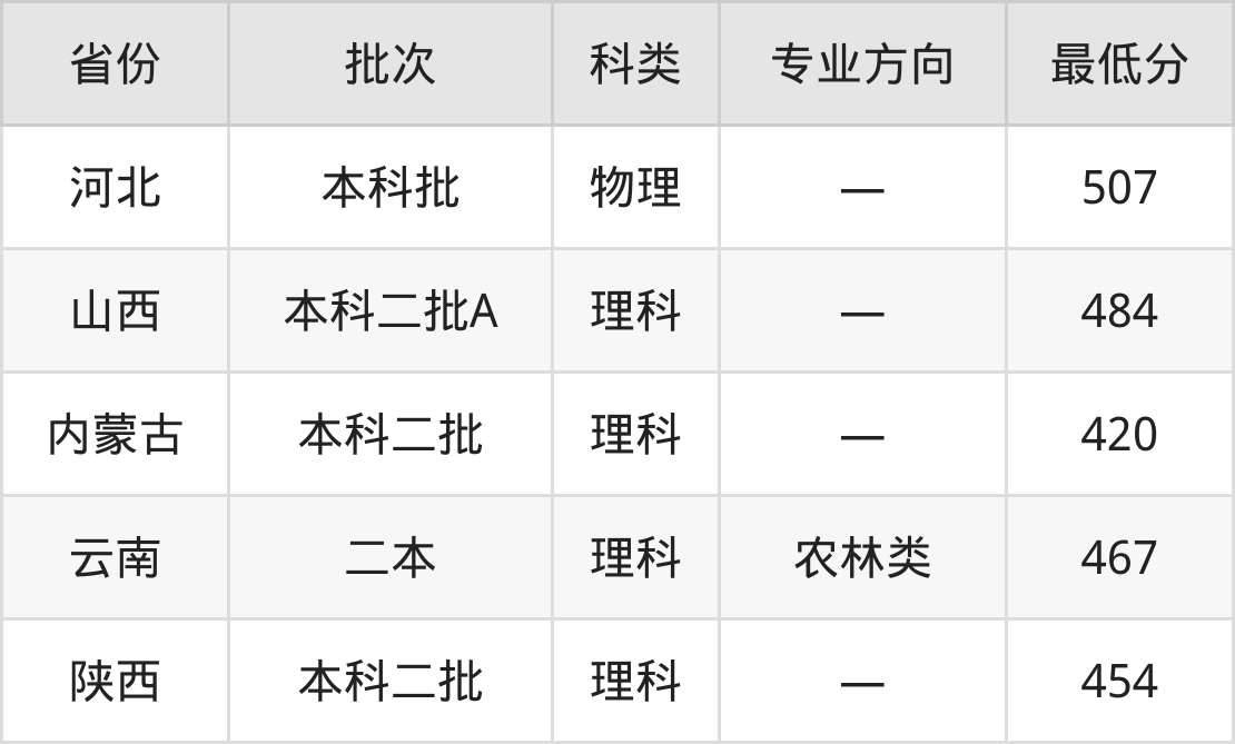 西南林业大学水土保持与荒漠化防治专业在全国各省最低录取分数线为420分(内蒙古理科),除此之外,在其余地区的最低分为河北物理类507分、山西理科484分、云南理科467分、陕西理科454分,以上数据均为2024年数据,供2025年高考生参考。