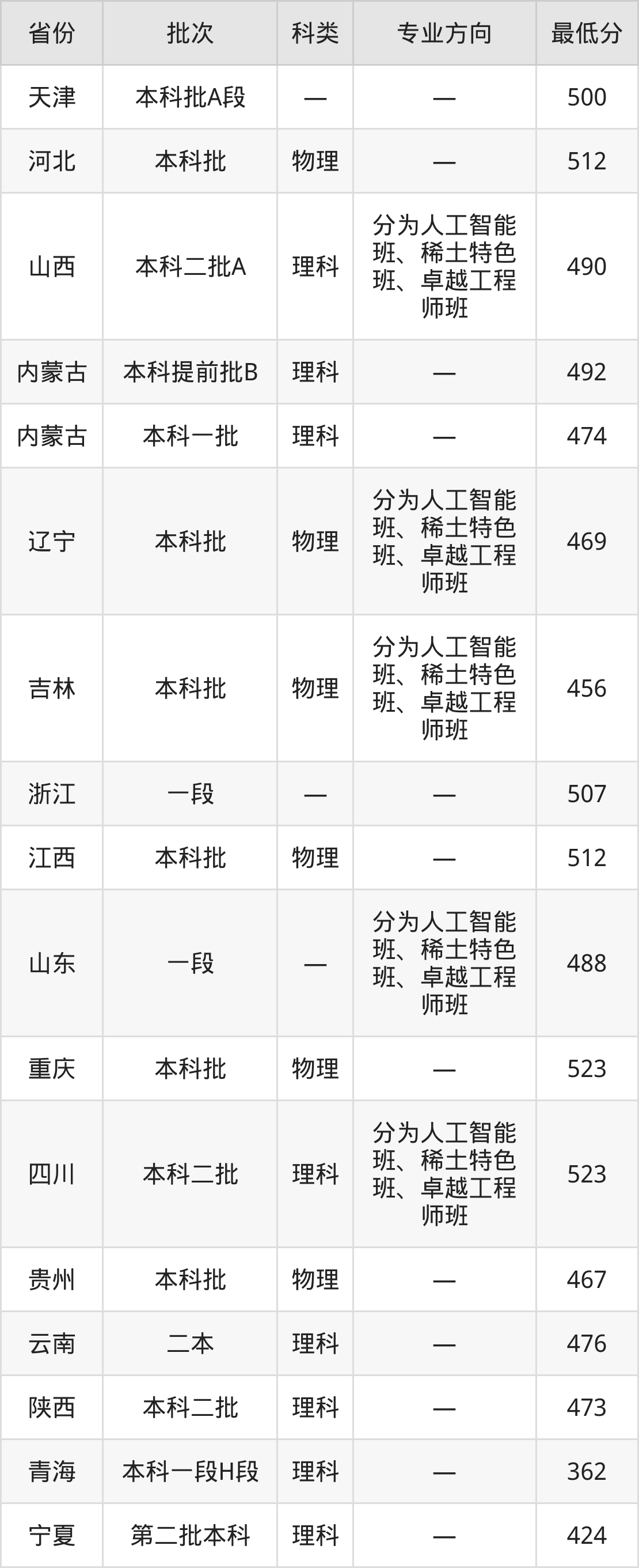内蒙古科技大学冶金工程专业录取分数线从362分到523分不等,在部分地区的最低分数线如下: