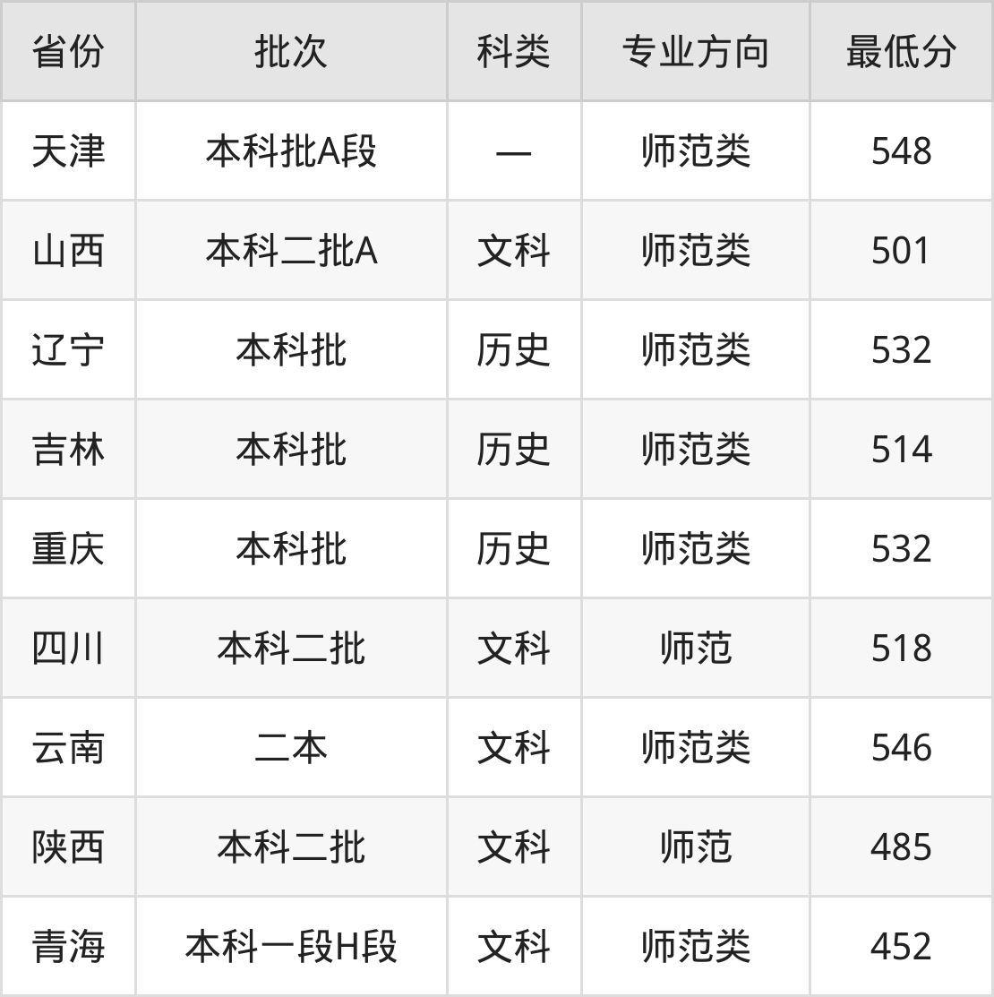 山西大同大学汉语言文学专业录取分数线从452分到548分不等,最低分数线如下:
