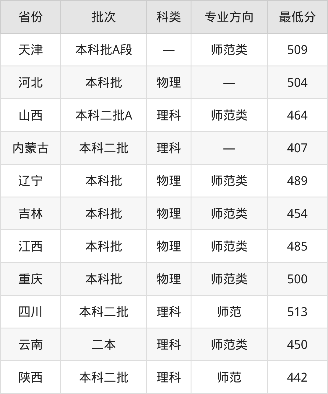 忻州师范学院物理学专业录取分数线从407分到513分不等,在部分地区的最低分数线如下: