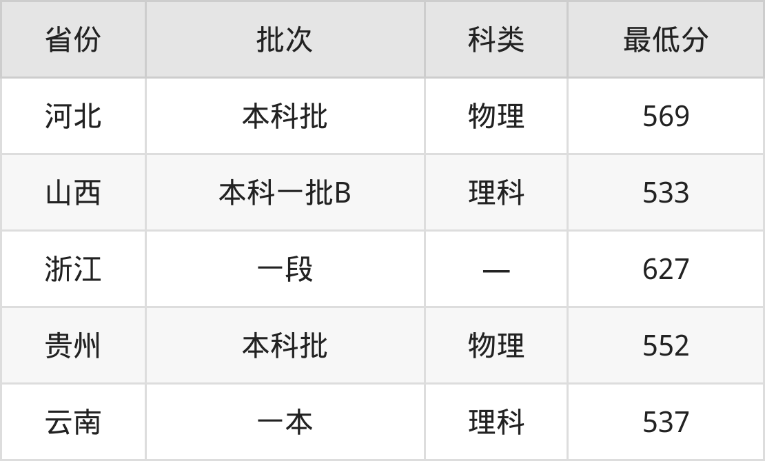 浙江师范大学地理信息科学专业在全国各省最低录取分数线为533分(山西理科),除此之外,在其余地区的最低分为云南理科537分、河北物理类569分、浙江627分、贵州物理类552分,以上数据均为2024年数据,供2025年高考生参考。