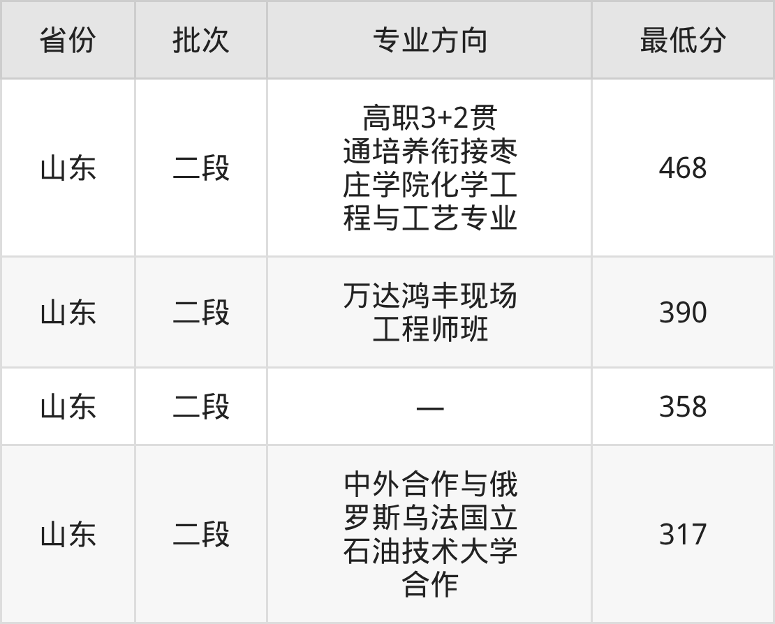 东营职业学院石油化工技术专业录取分数线从317分到468分不等,最低分数线如下: