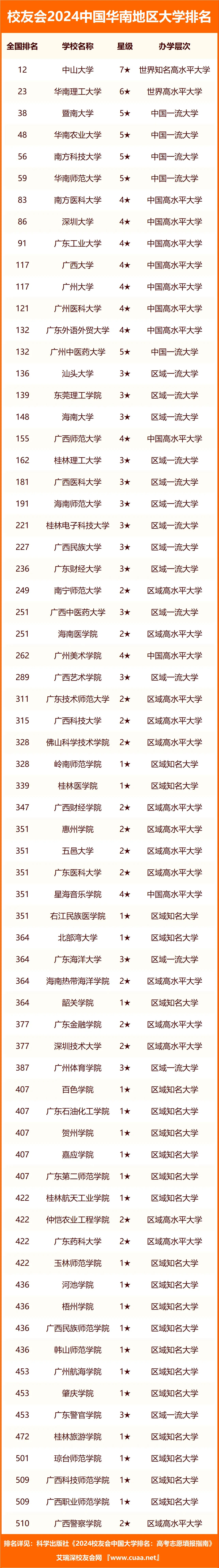 根据校友会2024年华南地区的公办本科大学排名表,可以得知国内排名前10的华南地区的公办本科大学分别是:
