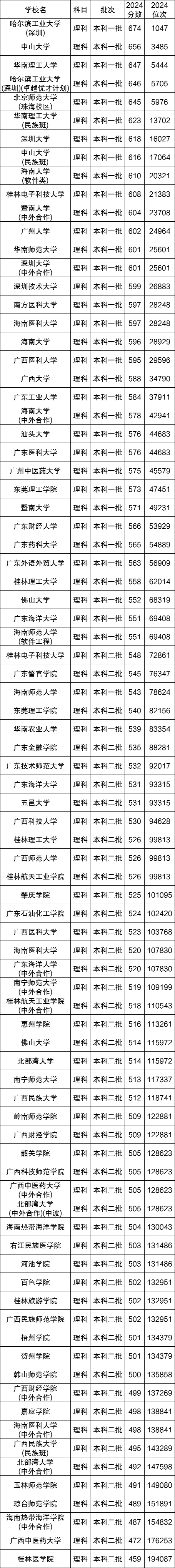 下面是2024年各华南地区的公办本科大学在四川省理科的录取分数线