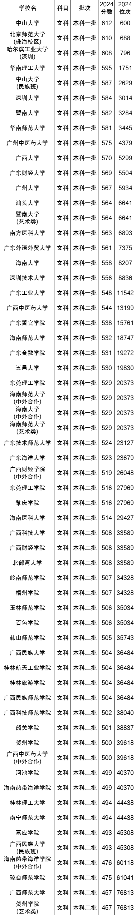 下面是2024年各华南地区的公办本科大学在四川省文科的录取分数线(供参考):