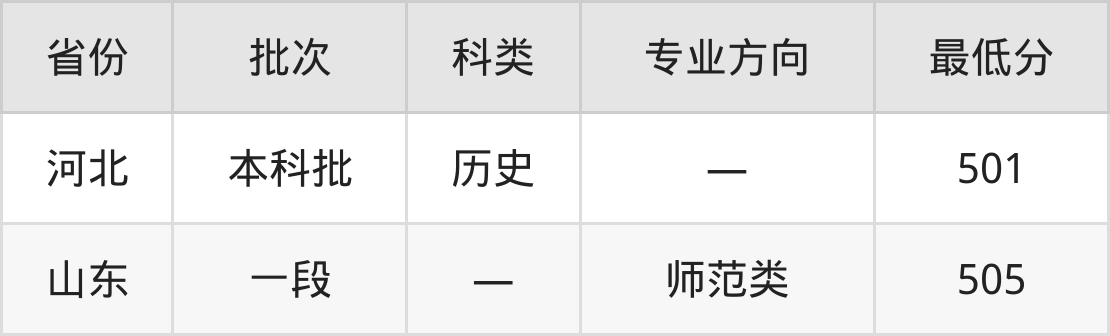 河北师范大学汇华学院思想政治教育专业录取分数线从501分到505分不等,最低分数线如下: