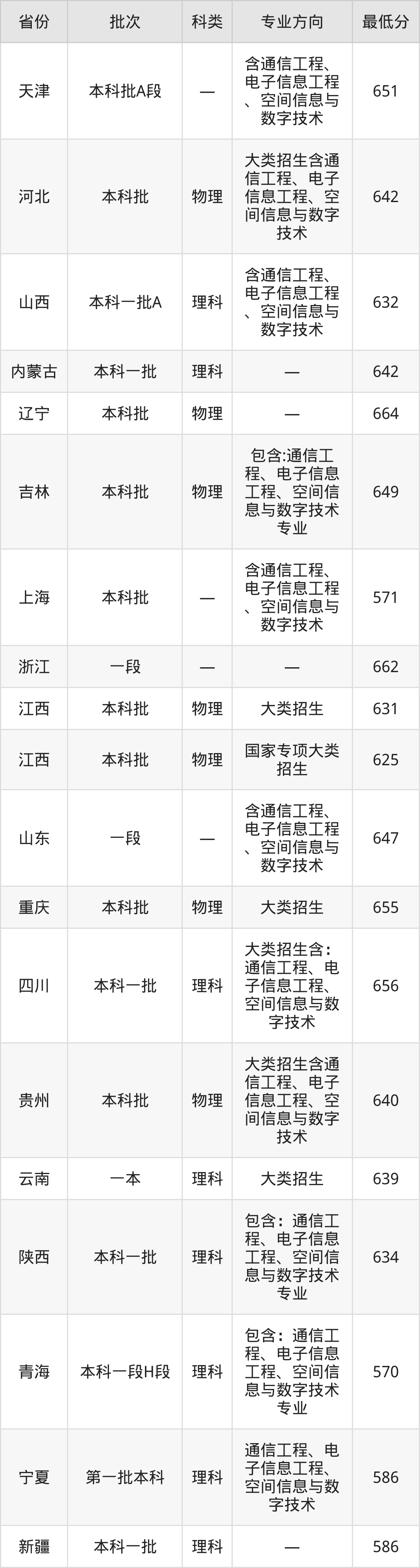 北京邮电大学通信工程专业在全国各省录取分数线: