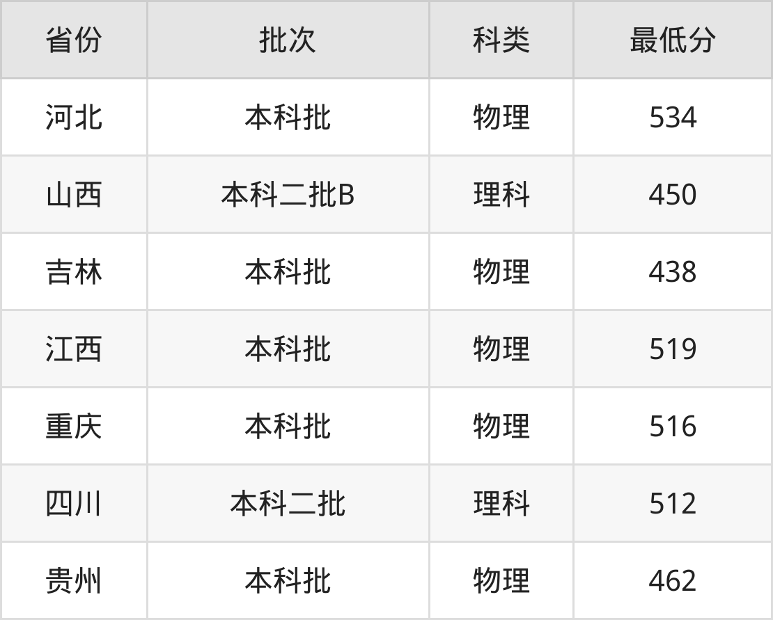 三明学院计算机科学与技术专业在全国各省最低录取分数线为438分(吉林物理类),除此之外,在其余地区的最低分为江西物理类519分、重庆物理类516分、四川理科512分、贵州物理类462分等,以上数据均为2024年数据,供2025年高考生参考。