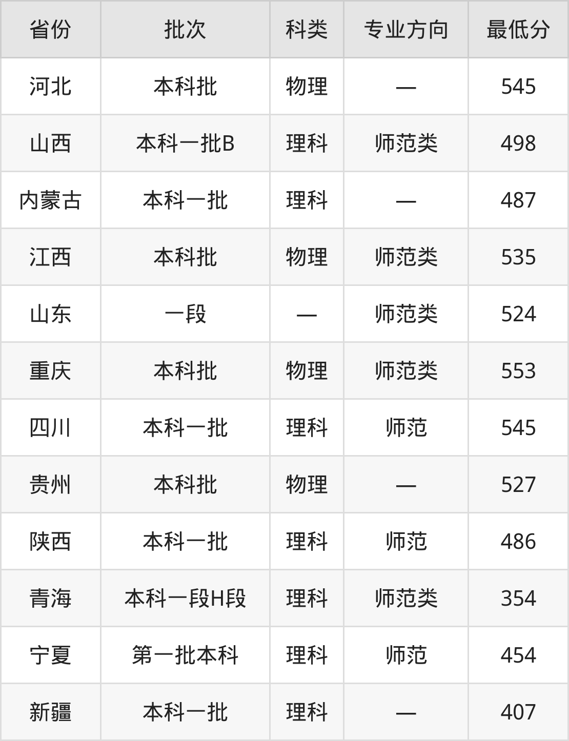 海南师范大学物理学专业录取分数线从354分到553分不等,在部分地区的最低分数线如下: