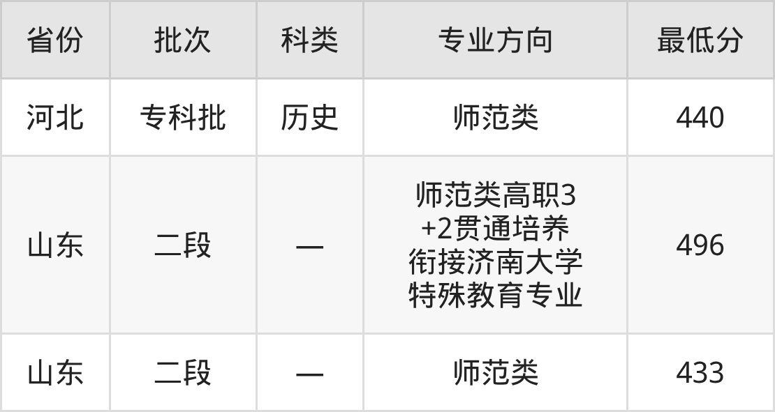 山东特殊教育职业学院特殊教育专业录取分数线从433分到496分不等,最低分数线如下: