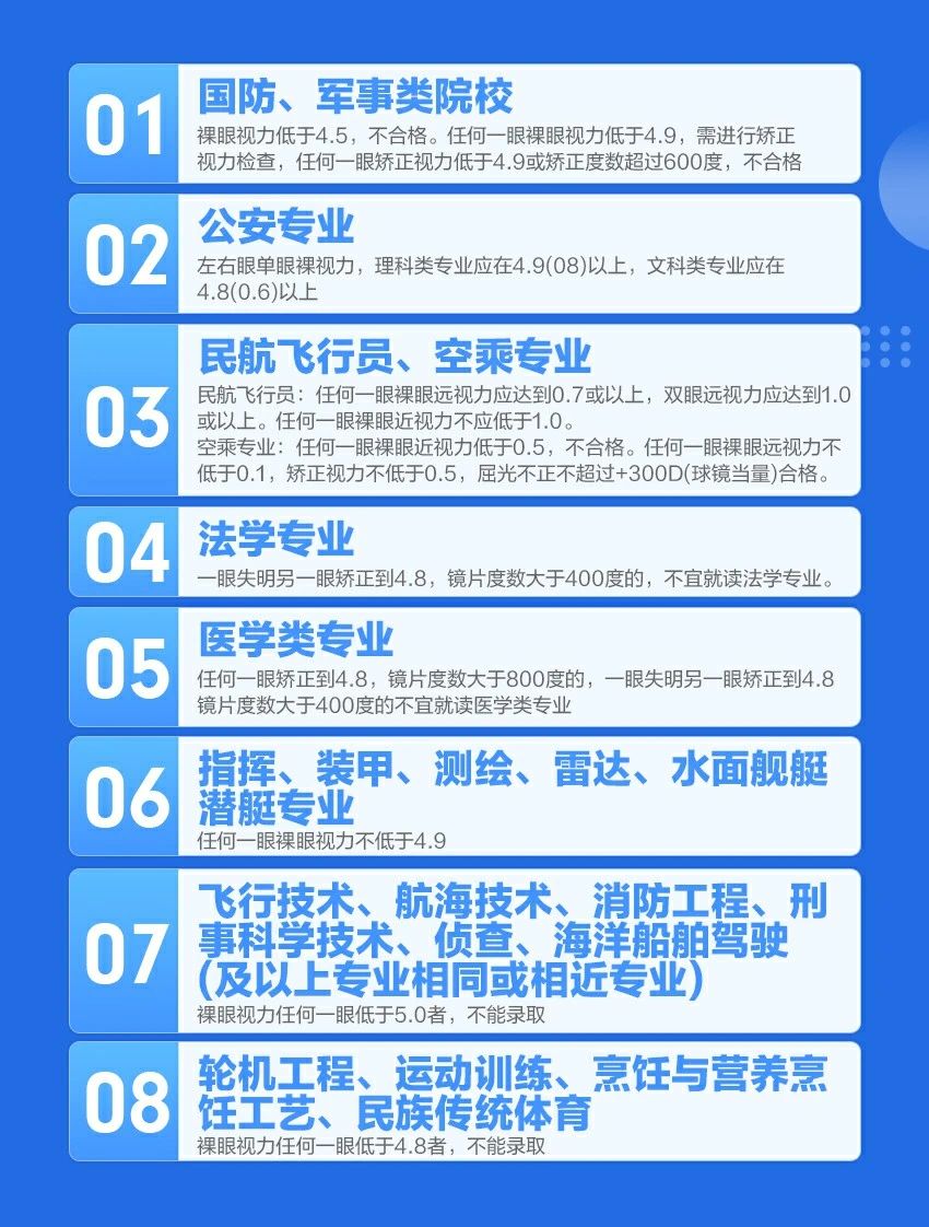 其次,不少专业提到的视力要求各位考生也要仔细阅读,究竟是裸眼视力还是矫正视力,大家需要做区分。所以,如果大家想报考某个专业,一定要提前通过相关的网站去具体了解,以免因为视力问题而错过选择专业的机会。