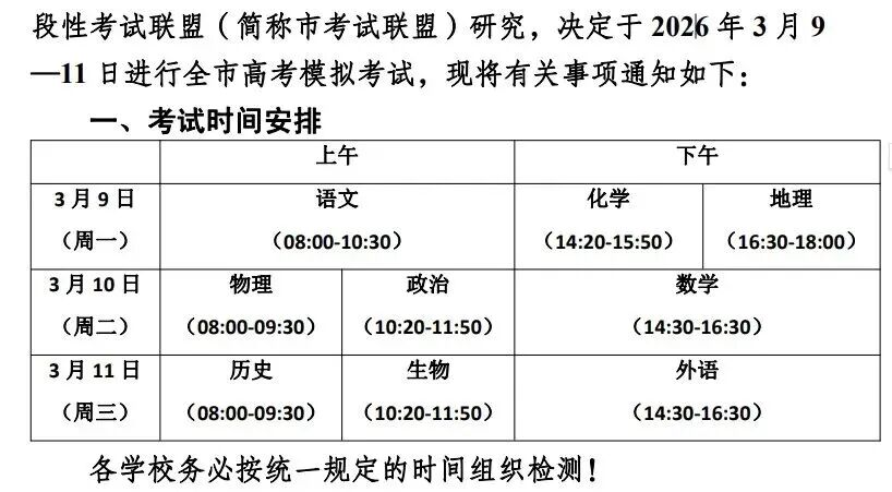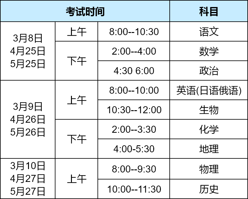 | 3月11日(星期三) | 上午 | 高三历史8:00~9:30 |