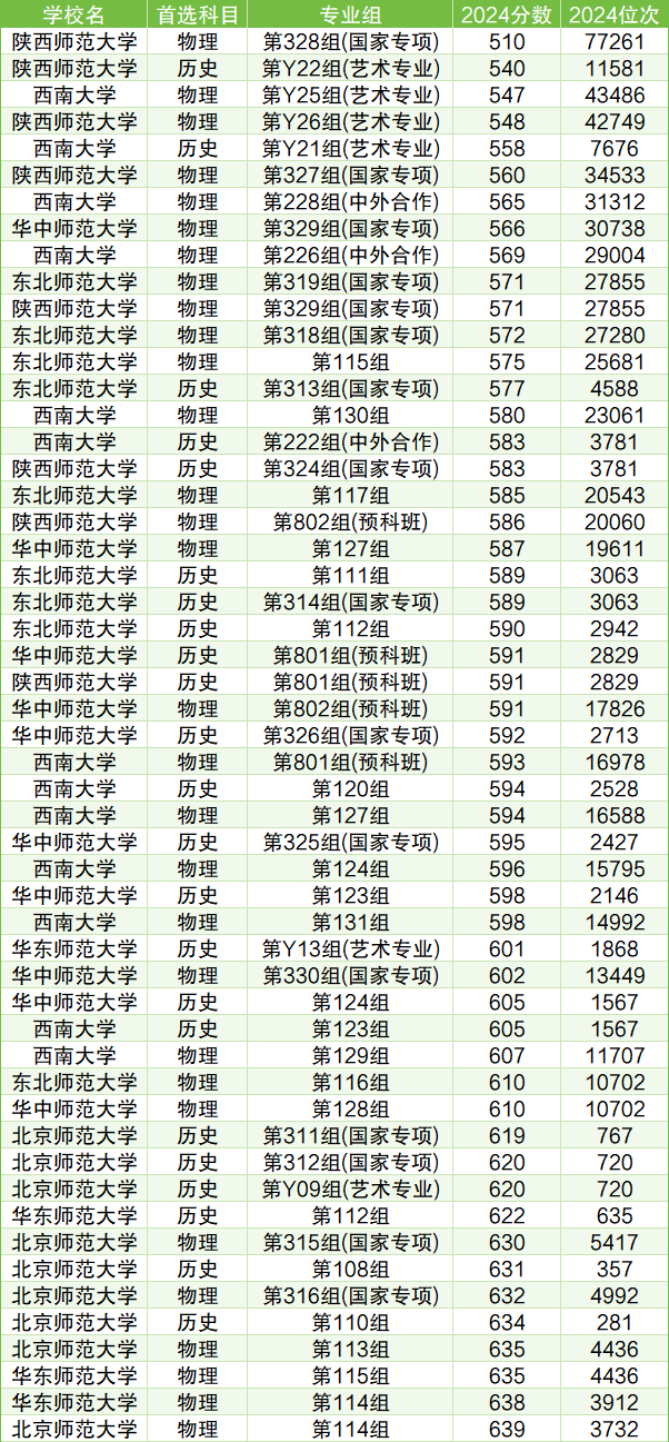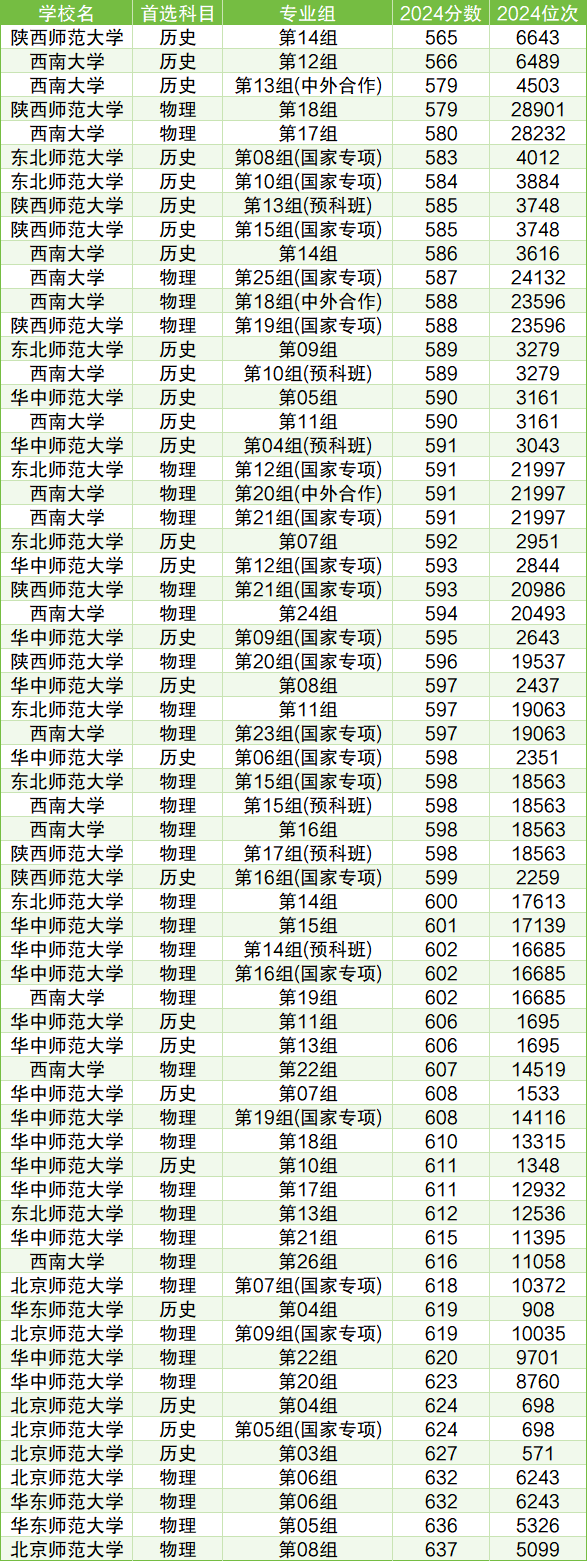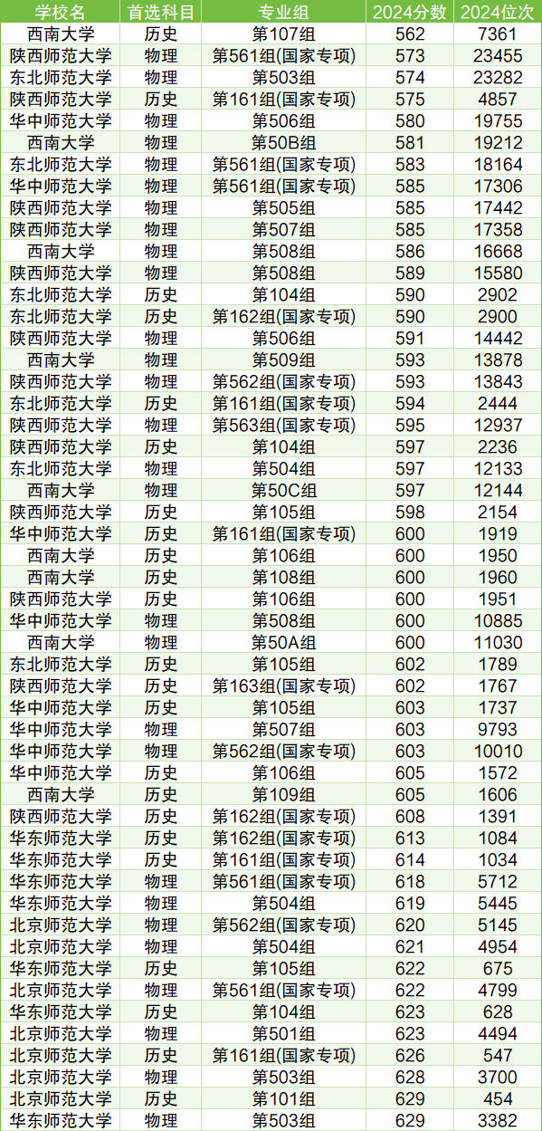 以物理类为例,考生可报考的最低分国家公费师范生大学有陕西师范大学(第18组),2024年最低分均为579分,位次范围在5099-28901名之间。