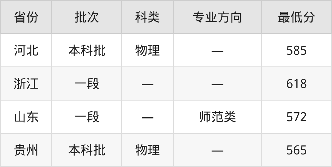 江苏师范大学数学与应用数学专业在全国各省最低录取分数线为565分(贵州物理类),除此之外,在其余地区的最低分为河北物理类585分、浙江618分、山东572分,以上数据均为2024年数据,供2025年高考生参考。