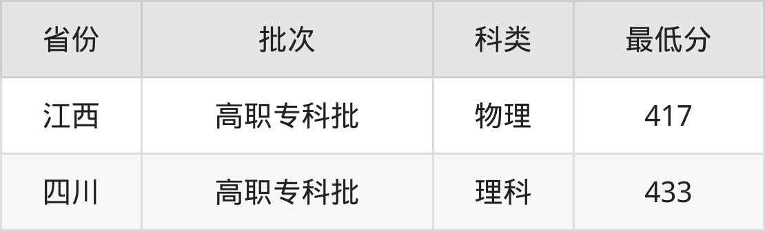 福建船政交通职业学院空中乘务专业录取分数线从417分到433分不等,最低分数线如下:
