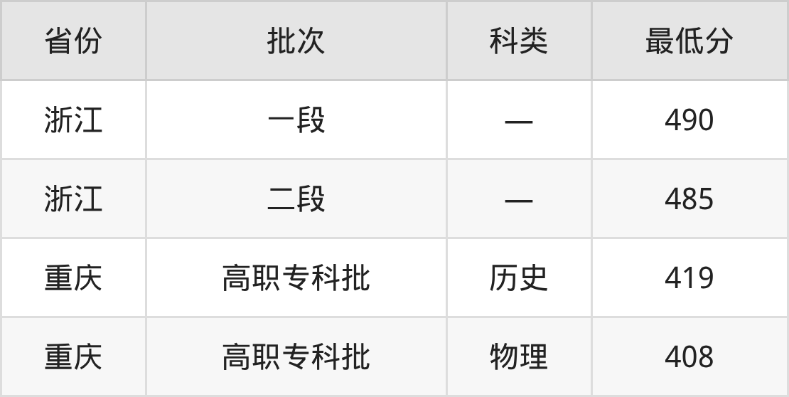 江西司法警官职业学院社区矫正专业在全国各省最低录取分数线为408分(重庆物理类),除此之外,在其余地区的最低分为浙江485分,以上数据均为2025年数据,供2026年高考生参考。