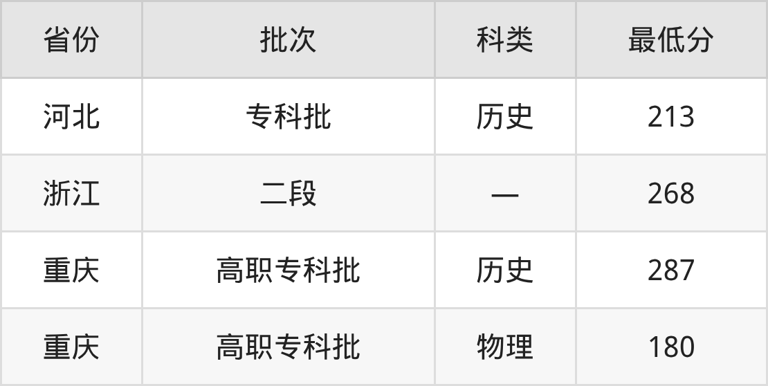 重庆电讯职业学院现代物流管理专业录取分数线从180分到287分不等,最低分数线如下: