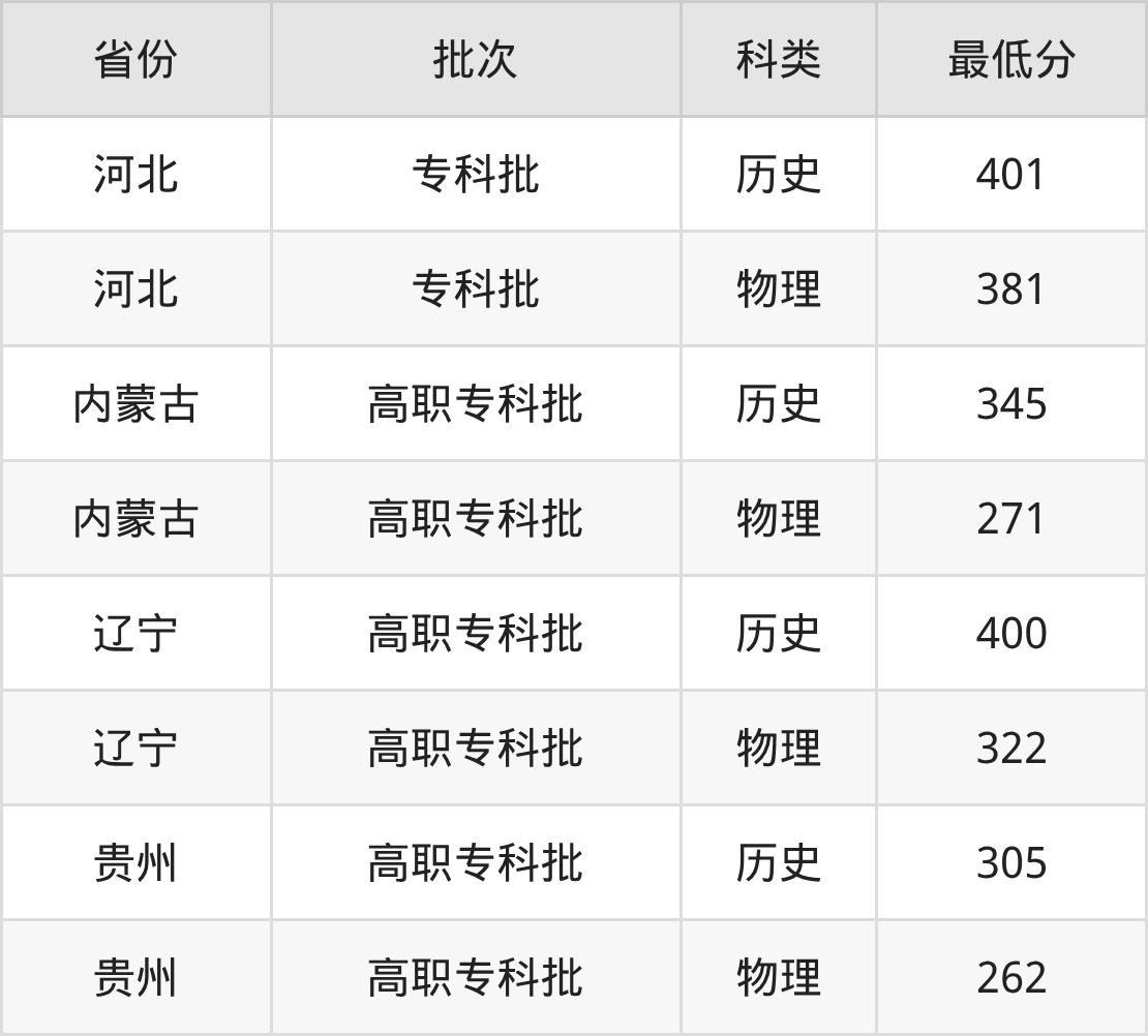黑龙江旅游职业技术学院药品质量与安全专业录取分数线从262分到401分不等,最低分数线如下: