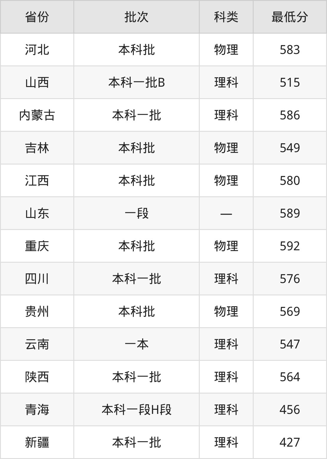 武汉科技大学临床医学专业在全国各省最低录取分数线为427分(新疆理科),除此之外,在其余地区的最低分为山西理科515分、江西物理类580分、重庆物理类592分、云南理科547分等,以上数据均为2024年数据,供2025年高考生参考。