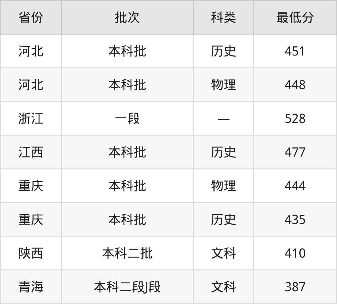 南宁理工学院学前教育专业在全国各省最低录取分数线为387分(青海文科),除此之外,在其余地区的最低分为河北物理类448分、浙江528分、江西历史类477分、重庆历史类435分等,以上数据均为2024年数据,供2025年高考生参考。