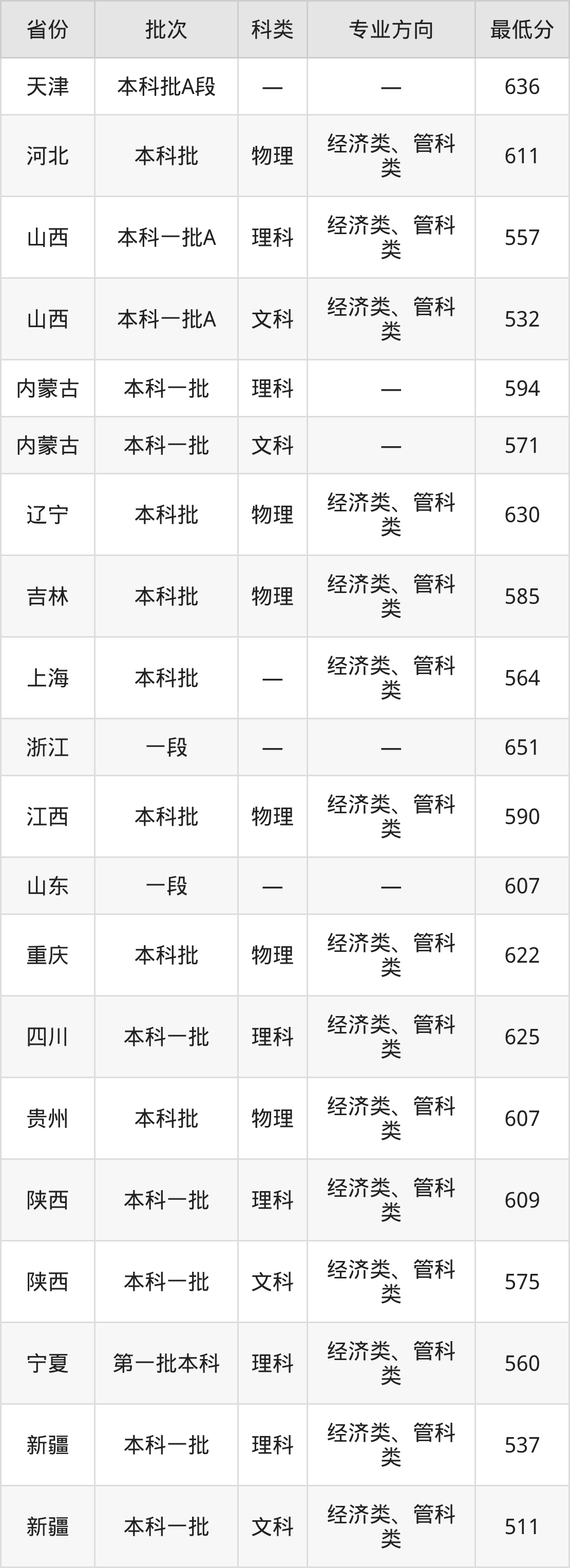 北京交通大学经济管理试验班专业录取分数线从511分到651分不等,在部分地区的最低分数线如下: