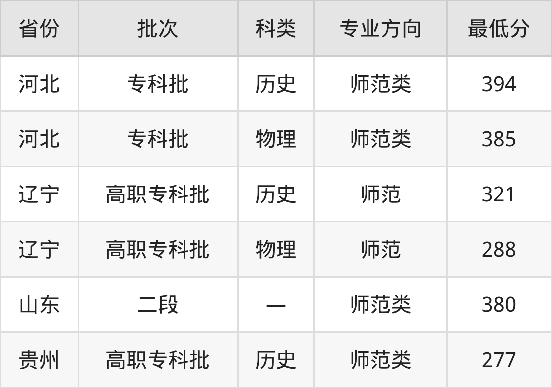 沧州幼儿师范高等专科学校学前教育专业录取分数线从277分到394分不等,最低分数线如下: