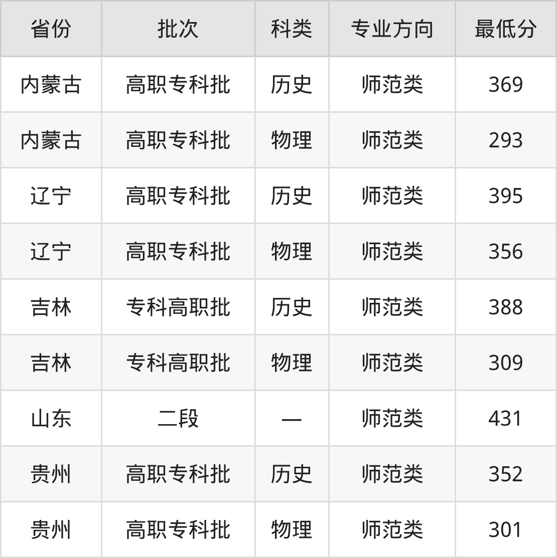 铁岭师范高等专科学校小学教育专业录取分数线从293分到431分不等,最低分数线如下: