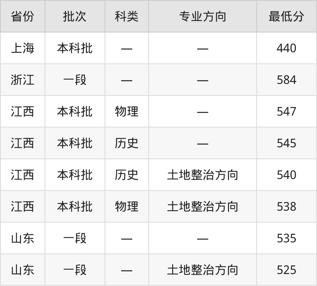 江西农业大学土地资源管理专业录取分数线从440分到584分不等,最低分数线如下: